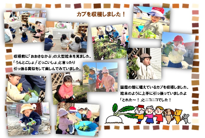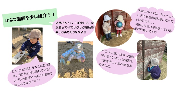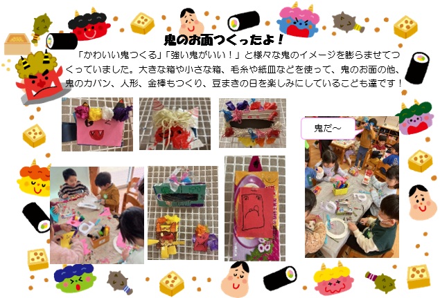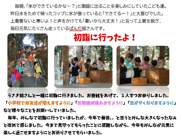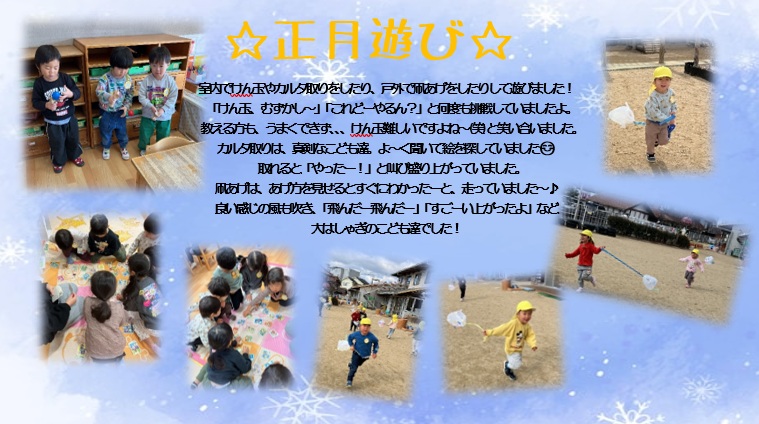 | こども広場 No.29(R8.2.28) 1月のクラスの様子を紹介します 【ひよこ1組(0歳児)】 ![]() 【ひよこ2組(1歳児)】 ![]() 【あひる組(1歳児)】 ![]() 【りす組(2歳児)】 ![]() 【うさぎ組(3歳児)】 ![]() 【こあら組(4歳児)】 ![]() ![]() 【ぱんだ組(5歳児)】 ![]() ![]() |
