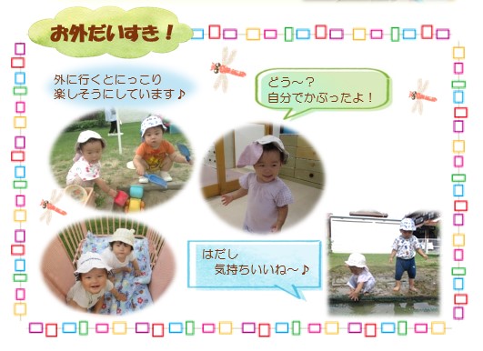 | こども広場 No.26(R7.8.29) 8月の各クラスの様子を紹介します 【ひよこ1組(0歳児)】 ![]() 【ひよこ2組(1歳児)】 ![]() ![]() 【あひる組(1歳児)】 ![]() ![]() 【りす組(2歳児)】 ![]() ![]() 【うさぎ組(3歳児)】 ![]() ![]() 【こあら組(4歳児)】 ![]() 【ぱんだ組(5歳児)】 ![]() ![]() |