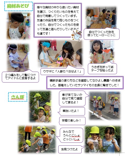 | こども広場 No.23(R7.8.5) 7月の各クラスの様子を紹介します 【ひよこ1組(0歳児)】 ![]() 【ひよこ2組(1歳児)】 ![]() 【あひる組(1歳児)】 ![]() 【りす組(2歳児)】 ![]() 【うさぎ組(3歳児)】 ![]() 【こあら組(4歳児)】 ![]() ![]() 【ぱんだ組(5歳児)】 ![]() |