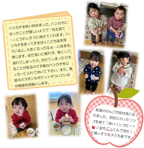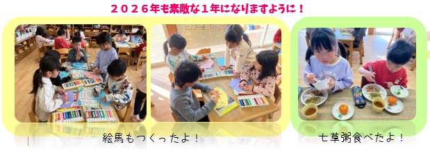 | こども広場 No.29(R8.2.28) 1月のクラスの様子を紹介します 【ひよこ1組(0歳児)】 ![]() 【ひよこ2組(1歳児)】 ![]() 【あひる組(1歳児)】 ![]() 【りす組(2歳児)】 ![]() 【うさぎ組(3歳児)】 ![]() 【こあら組(4歳児)】 ![]() ![]() 【ぱんだ組(5歳児)】 ![]() ![]() |