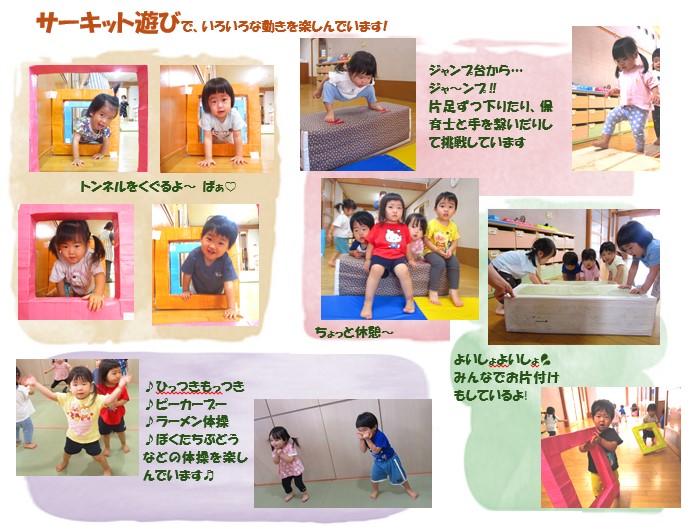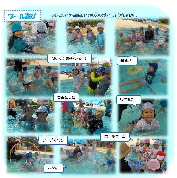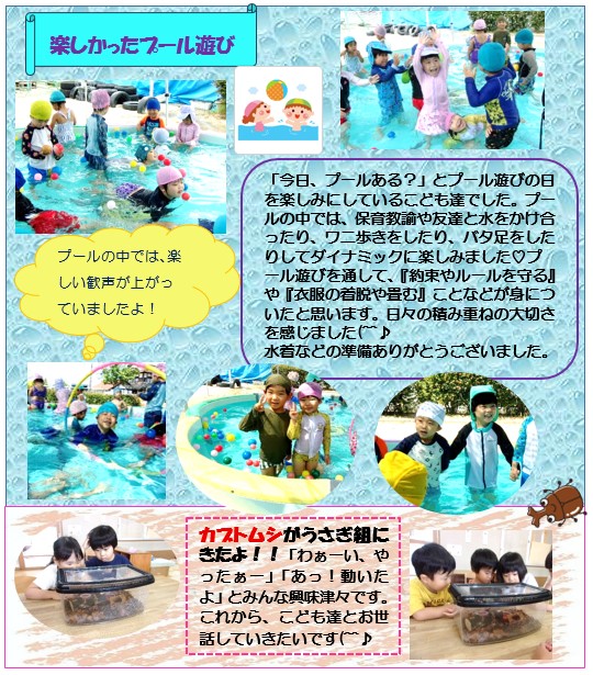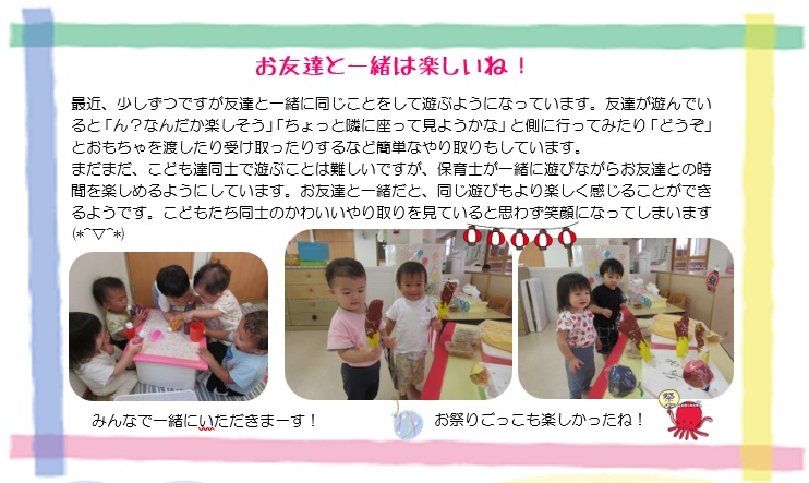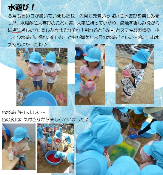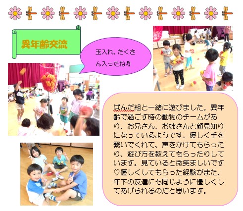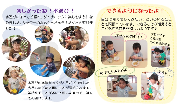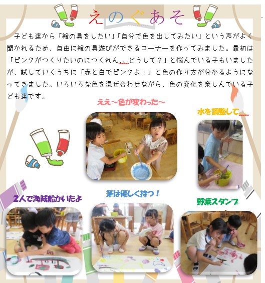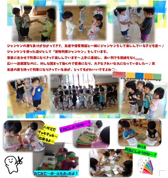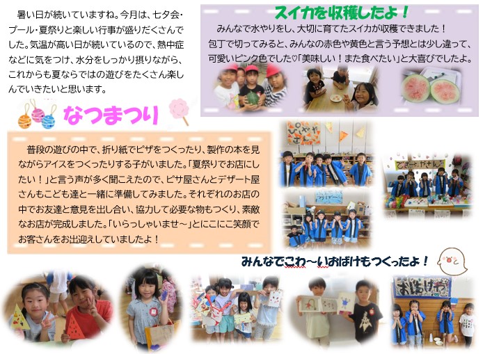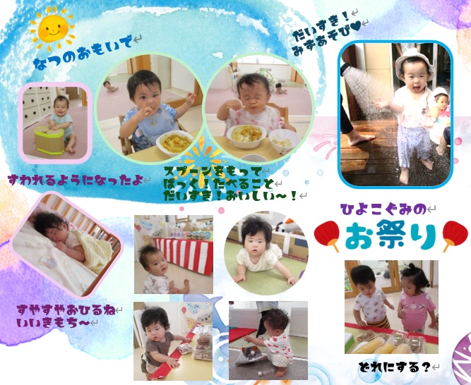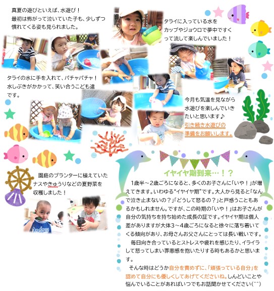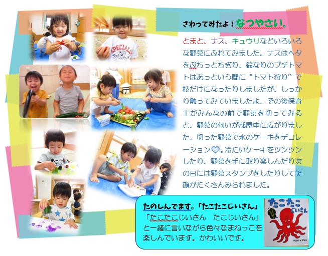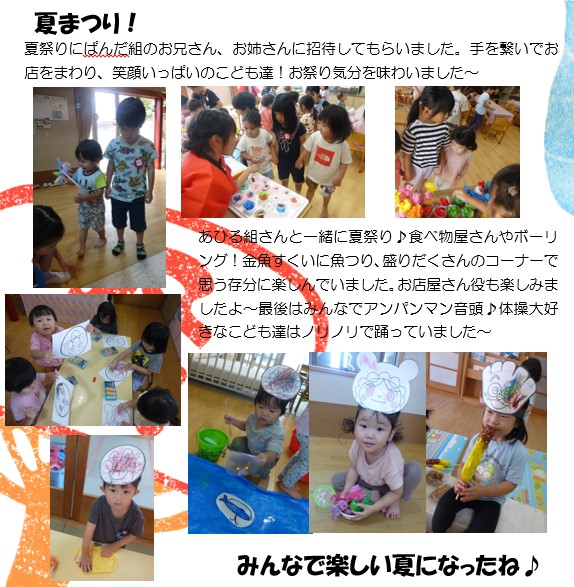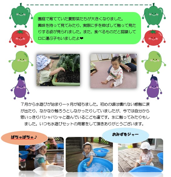 | こども広場 No.23(R7.8.5) 7月の各クラスの様子を紹介します 【ひよこ1組(0歳児)】 ![]() 【ひよこ2組(1歳児)】 ![]() 【あひる組(1歳児)】 ![]() 【りす組(2歳児)】 ![]() 【うさぎ組(3歳児)】 ![]() 【こあら組(4歳児)】 ![]() ![]() 【ぱんだ組(5歳児)】 ![]() |