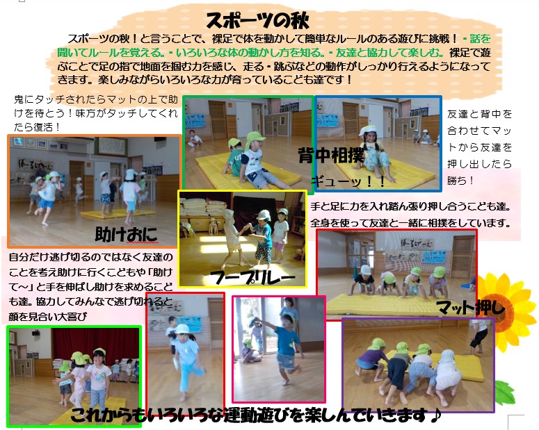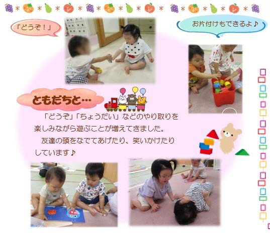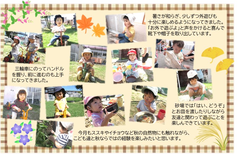 | こども広場 No.27(R7.10.27) 9月の各クラスの様子を紹介します 【ひよこ1組(0歳児)】 ![]() ![]() 【ひよこ2組(1歳児)】 ![]() 【あひる組(1歳児)】 ![]() 【りす組(2歳児)】 ![]() 【うさぎ組(3歳児)】 ![]() 【こあら組(4歳児)】 ![]() ![]() 【ぱんだ組(5歳児)】 ![]() ![]() |