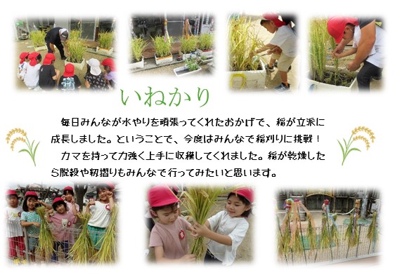 | こども広場 No.4(R6.8.29) 園庭での米作りを事務室前での発泡スチロール農法により身近に観察が出来ます。これから実る時期に鳥が食べ始め・・・。かかしの登場です❤。さらに台風が心配な下旬です!