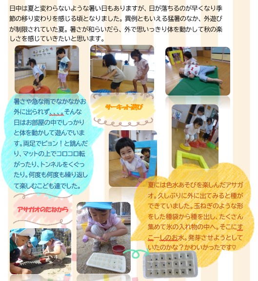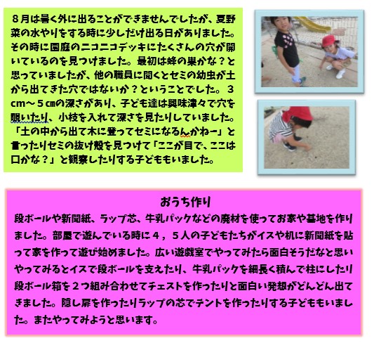 | こども広場 No.26(R7.8.29) 8月の各クラスの様子を紹介します 【ひよこ1組(0歳児)】 ![]() 【ひよこ2組(1歳児)】 ![]() ![]() 【あひる組(1歳児)】 ![]() ![]() 【りす組(2歳児)】 ![]() ![]() 【うさぎ組(3歳児)】 ![]() ![]() 【こあら組(4歳児)】 ![]() 【ぱんだ組(5歳児)】 ![]() ![]() |