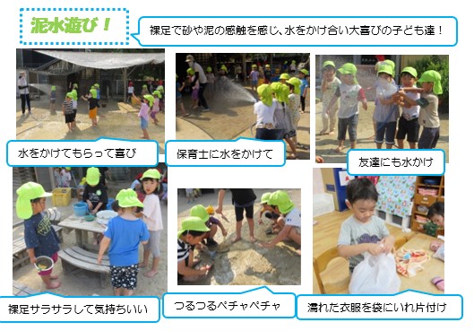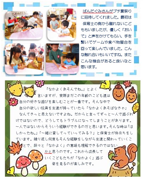 | こども広場 No.1(R6.8.5) 残暑お見舞い申し上げます 地域共生社会を実現するために「地域(かんなの家)・園児・保護者」の「つながる・つなげる・」ために皆様方へ今後毎週月曜日にお届けをしていきますので宜しくお願い致します。 猛暑の毎日ですが、子ともたちは、熱中症警戒アラートによる戸外遊びが思い切り出来ない日々です。せめて全クラス水遊びでの歓声が響いています。 地域の自治会子ども会との「触れ合い交流会」を開催しました。1年生から6年生の児童とゲームなどの交流をし園児は、お兄さんお姉さんのように親しむ姿に、大きく成長する学校生徒の頼もしさに触れました。 また、小学校教師2名の保育体験もあり小学校との連携を身近に感じる事ができました。 |